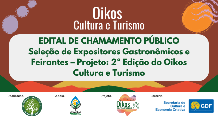 O Movimento Comunitário do Jardim Botânico – MCJB, Organização da Sociedade Civil de Interesse Público (OSCIP), sem fins econômicos, torna público o presente Edital de Chamamento Público para seleção de expositores gastronômicos e feirantes, interessados em participar dos macroeventos culturais e comunitários do projeto Oikos Cultura e Turismo – 2ª Edição, conforme as condições a seguir estabelecidas.