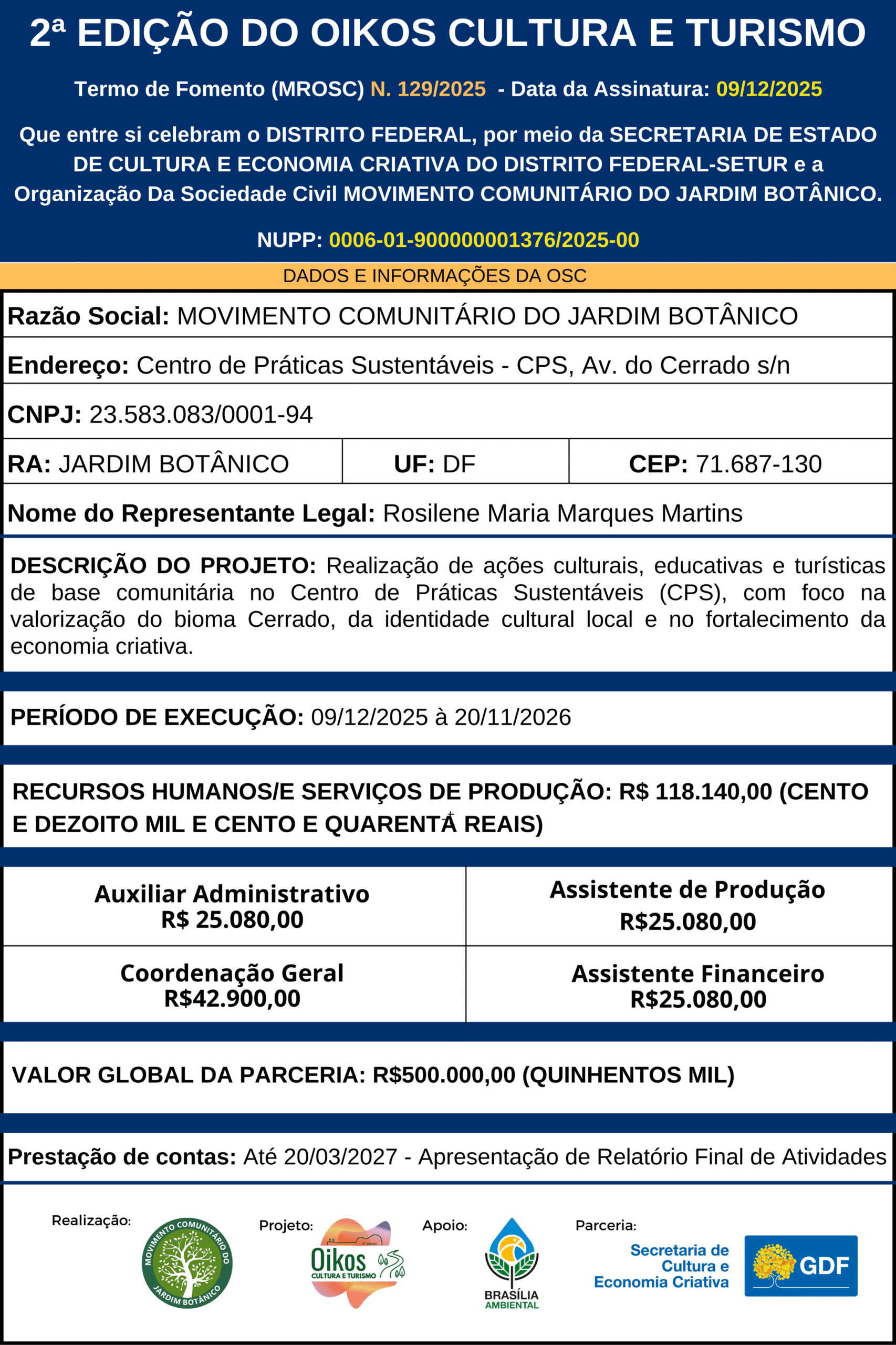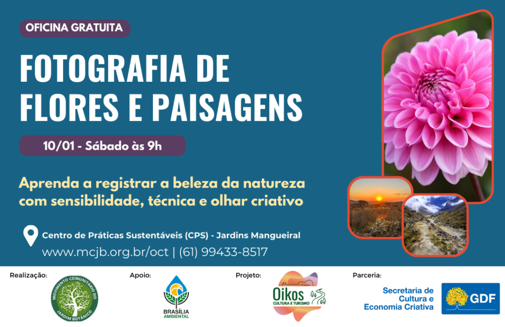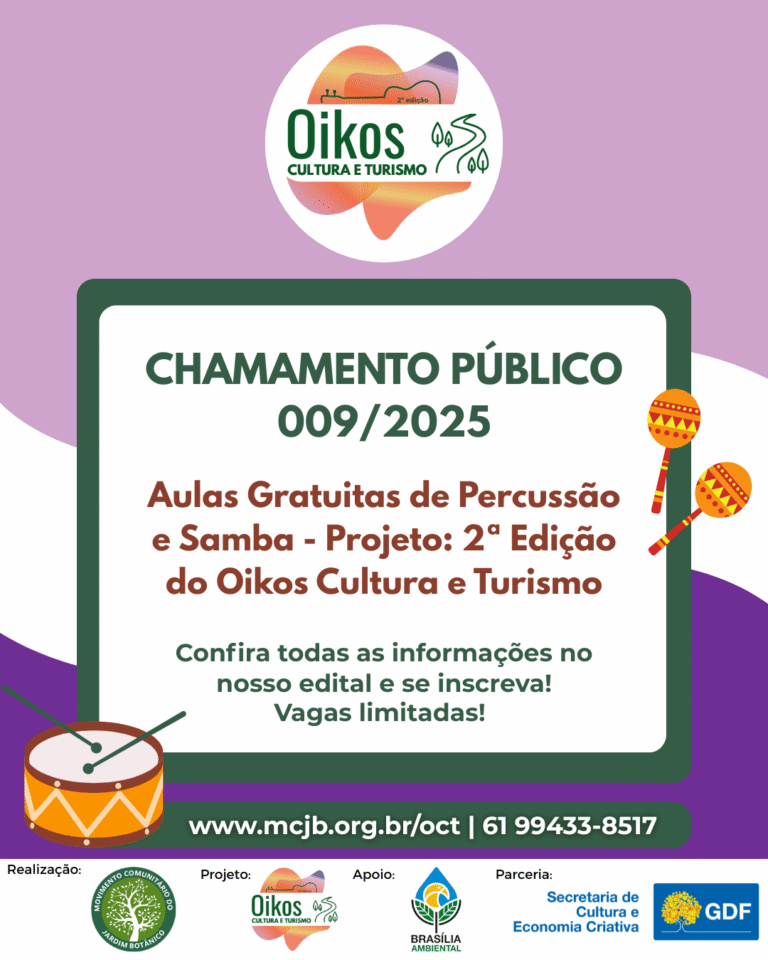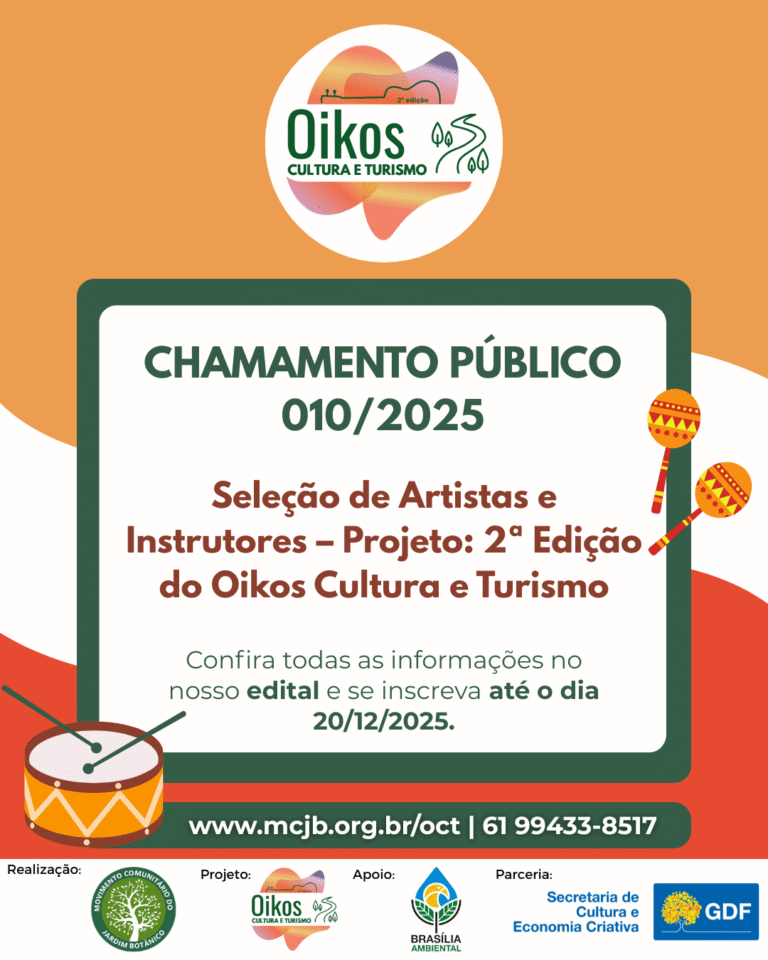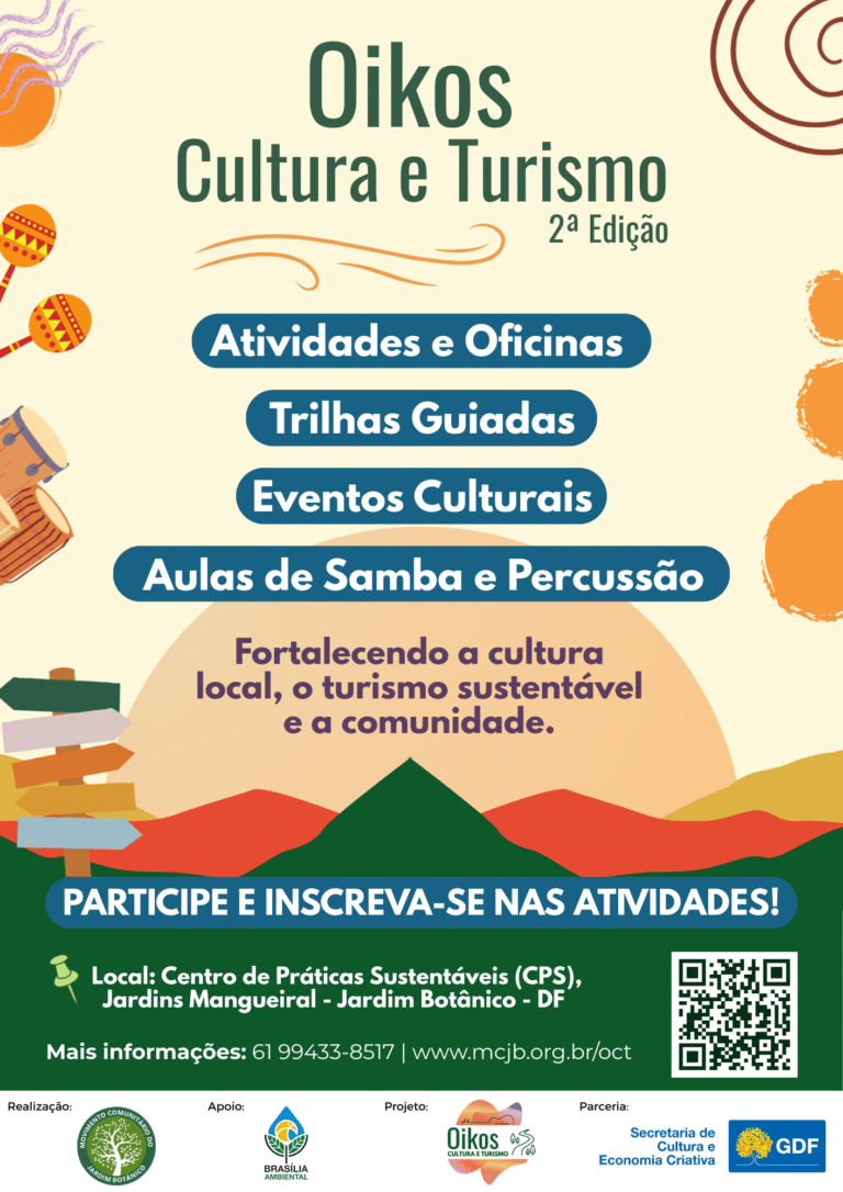 O Oikos Cultura e Turismo é um projeto realizado pelo Movimento Comunitário do Jardim Botânico (MCJB), em parceria com a Secretaria de Cultura e Economia Criativa do Distrito Federal, com apoio do Instituto Brasília Ambiental – IBRAM. A iniciativa integra cultura, educação, turismo comunitário e valorização ambiental, fortalecendo a identidade regional e estimulando o desenvolvimento sustentável no Jardim Botânico.