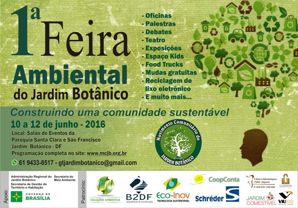 1ª Feira Ambiental do Jardim Botânico, com o tema “Construindo uma comunidade sustentável”, terá exposição de produtos e serviços sustentáveis, palestras, oficinas, debates, distribuição de mudas e muito mais! E servirá de palco para o lançamento do projeto