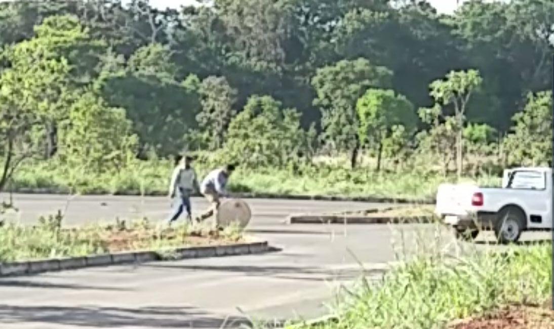 Após pararem o carro, arrancaram uma tampa de ferro no meio da pista, colocaram na caçamba e foram até outro bueiro de esgoto com tampa de concreto. Retiram a tampa de concreto e a remanejaram, utilizando-a para cobrir o bueiro aberto da tampa roubada.