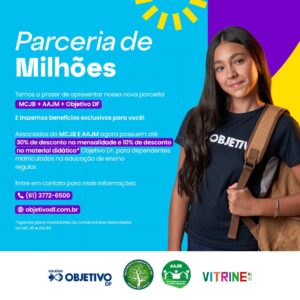 📚 Centro Educacional Sagrada Família – 10% de desconto cumulativo com 3% de pontualidade. 📚 Colégio Objetivo – até 30% de desconto na mensalidade + 10% de desconto no material didático para dependentes matriculados no ensino regular. 📚 Centro Educacional Dom José – 15% de desconto mediante comprovação de vínculo com a associação conveniada e 5% de desconto adicional para pagamentos antecipados até o primeiro dia útil de cada mês 📚 Blue Global School – até 20% de desconto na mensalidade + 10% de desconto no material didático (para dependentes matriculados no ensino regular) 📚 Colégio Digital – Oferece desconto de até 35% exclusivo para moradores de condomínios associados ao MCJB e AAJM. 📚 Centro Educacional Parque Encantado – Desconto de 10% na matrícula e 15% nas mensalidades para famílias associados ao MCJB. 📚 UNIP EAD Jardim Botânico – GRADUAÇÃO: 20% nas mensalidades até o final do curso. (Válido para novas matriculas realizadas no processo seletivo de 2026). PÓS-GRADUAÇÃO: 10% nas mensalidades até o final do curso (Válido para turmas iniciadas a partir de novembro de 2025 até novembro de 2026).