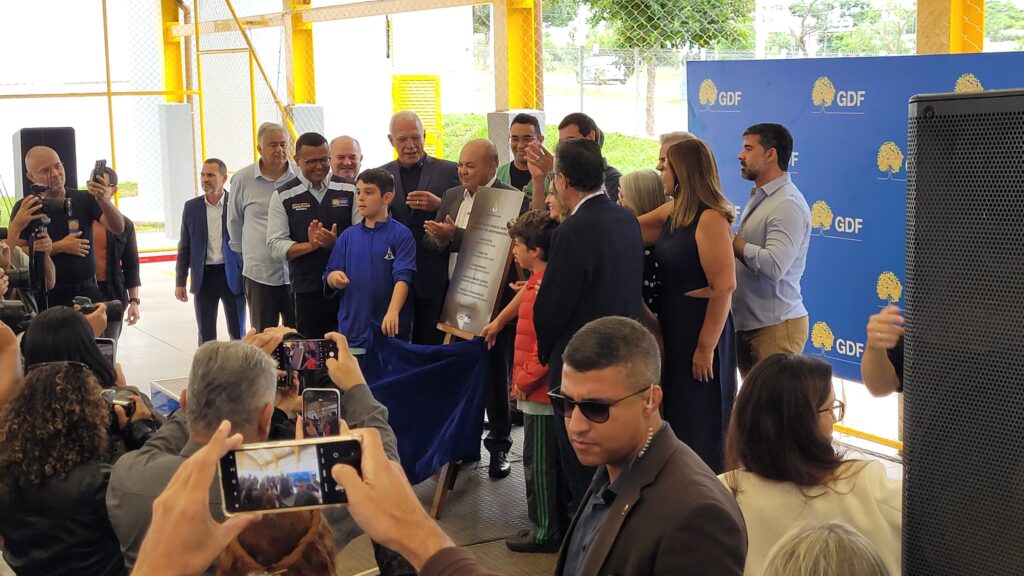 Momento da inauguração do Centro de Ensino Fundamental 01 do Jardins Mangueiral, durante a apresentação oficial da placa da nova unidade escolar, que amplia a oferta de vagas públicas na Região Administrativa do Jardim Botânico. | Foto: Arquivo MCJB