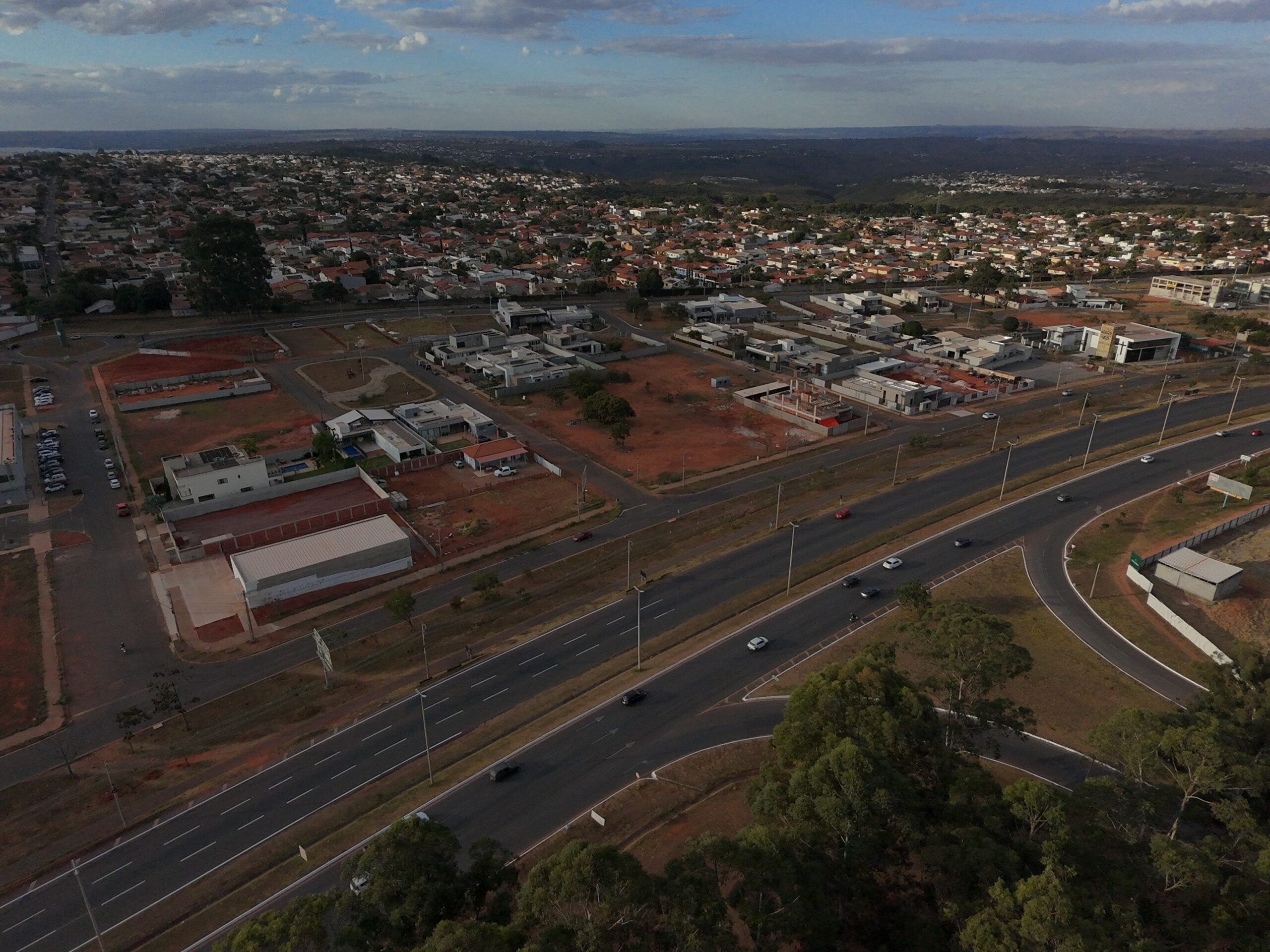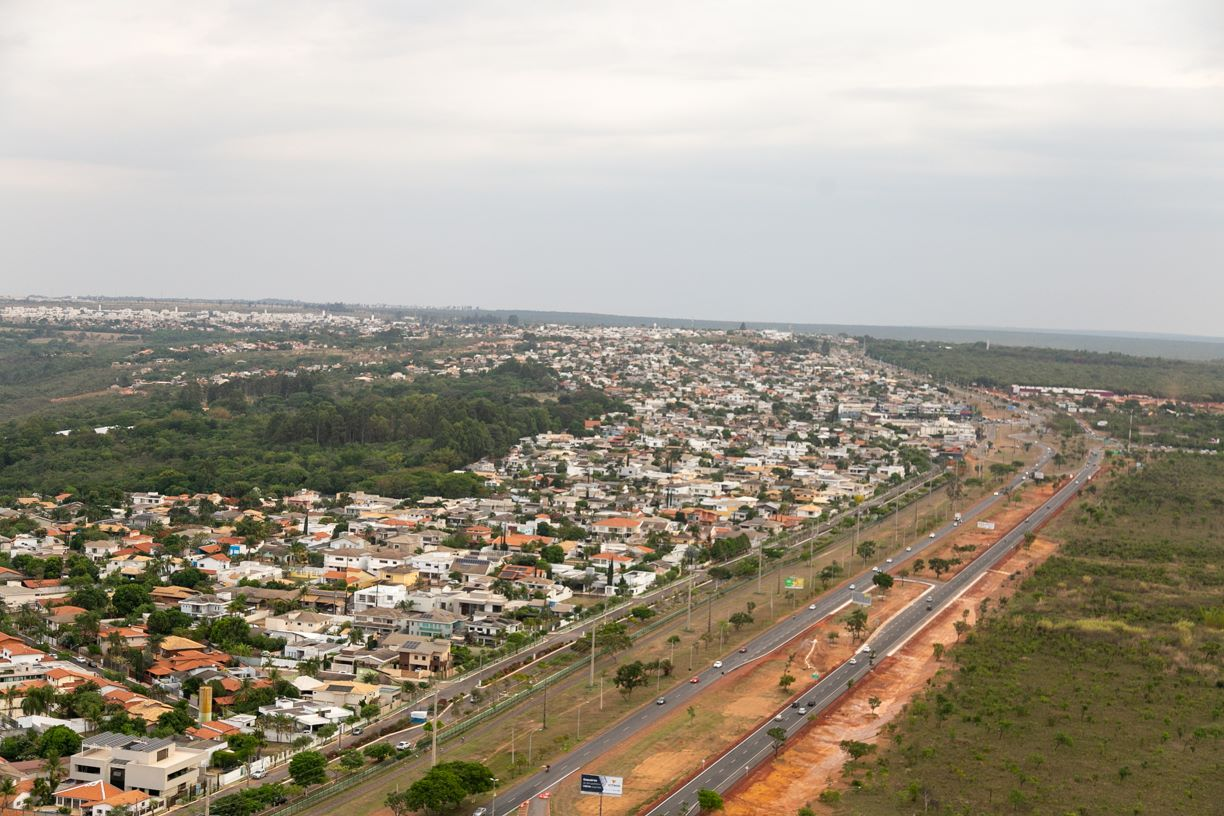 Vista aérea da Região Administrativa do Jardim Botânico revela a integração entre condomínios residenciais, áreas comerciais e a rodovia DF-001, um dos principais eixos de mobilidade que conectam a região ao restante do Distrito Federal. | Foto: Arquivo MCJB.
